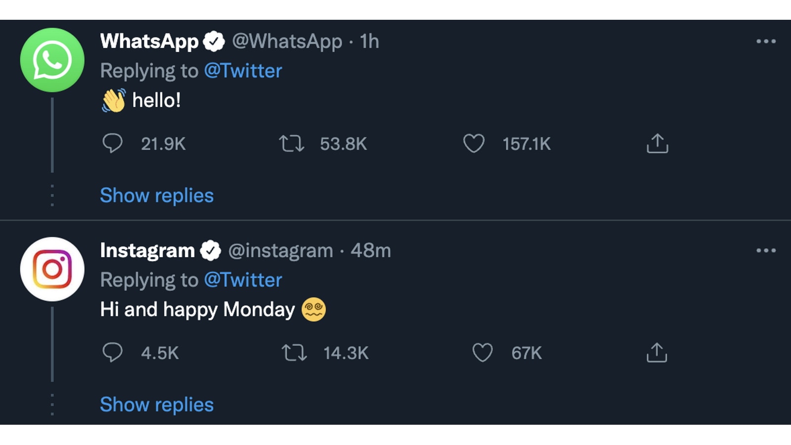As the world flocked to other sites to get their social media fix Twitter wrote. Wenn Drei down sind freut sich der Vierte - im konkreten Fall Twitter Für rund sechs Stunden waren Facebook Instagram und WhatsApp gestern. Herzchen für diesen Facebook-Witz.